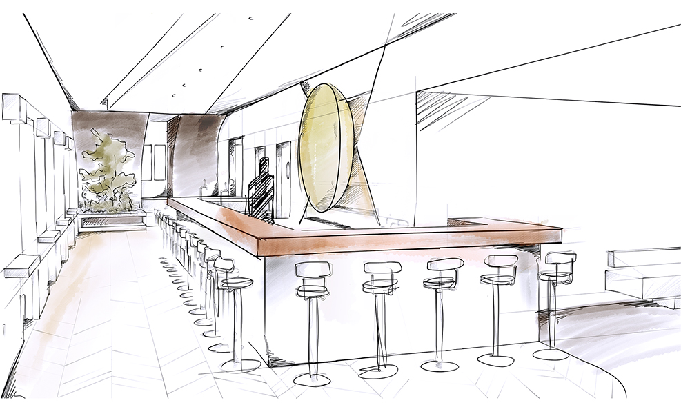 Challenges: Creating and producing big dimensions art installations for the venue. Designing and producing exterior and interior furniture. Finding the tree, that was cut 40 years ago, for the 14 meters long bar counter. The huge marble block for the 9 meters kitchen counter. All different suppliers to manage.